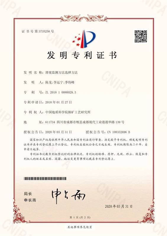 近日,自然资源部中国地质调查局探矿工艺研究所研发的“一种冰碛湖溃决洪水峰值流量预测的计算方法”和“滑坡监测方法选择方法”分获国家发明专利,专利号分别为ZL 2017 1 0207771.1和ZL 2018 1 0080029.3。
