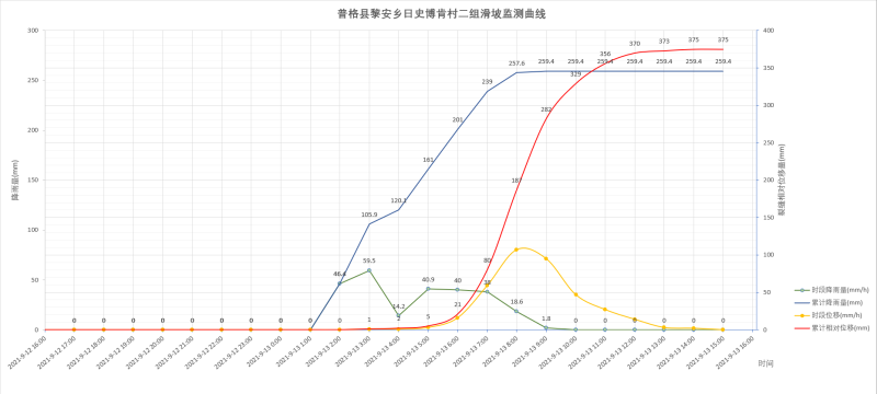2021年9月13日凌晨,四川省凉山州普格县黎安乡突发强降雨。启航彩安装在普格县黎安乡日史博肯村二组滑坡隐患点的自动雨量计1:36触发预警,预警广播开始发出警报。按照预警阈值,2:03发出暴雨红色预警信息。预警信息按照四川省凉山州防汛防地灾紧急预警响应流程发送至地质灾害防治相关人员。普格县人民政府、普格县自然资源局根据监测数据和现场情况综合研判,迅速做出决策启动应急预案,向黎安乡人民政府下达紧急撤离避险指令。黎安乡人民政府2:24紧急通知村组受威胁的27户126人实施避险转移。6:04至7:15安装在该滑坡点上的拉线裂缝计又连续4次发布位移预警,滑坡变形加剧,7:20分左右发生垮塌。由于预警及时,受威胁群众提前5小时成功避险,无人员伤亡。