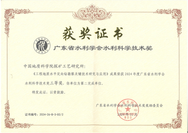 近日,由中国地质科学院探矿工艺研究所参与完成的“工程地质水平定向钻勘察关键技术研究与应用”项目,荣获2024年度广东省水利学会水利科学技术奖三等奖。