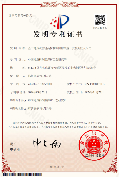 近日,中国地质调查局探矿工艺研究所申报的五项地质灾害监测预警、防治方面的发明专利获国家知识产权局授权。