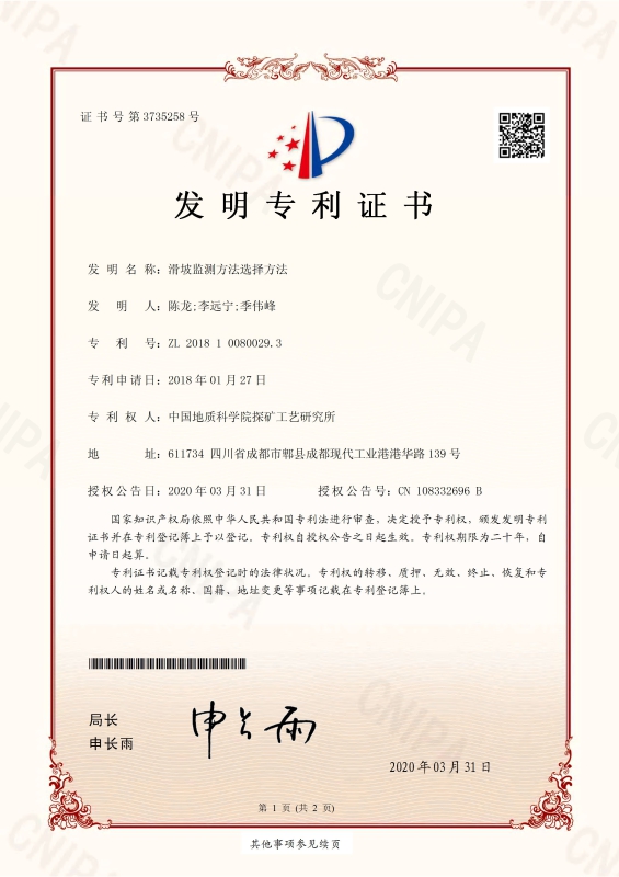 近日,自然资源部中国地质调查局探矿工艺研究所研发的“一种冰碛湖溃决洪水峰值流量预测的计算方法”和“滑坡监测方法选择方法”分获国家发明专利,专利号分别为ZL 2017 1 0207771.1和ZL 2018 1 0080029.3。